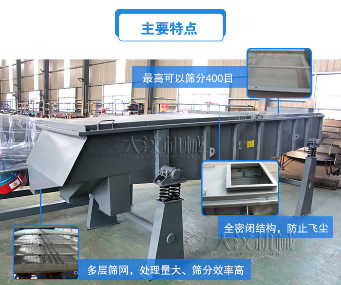 產品介紹:高頻直線振動篩振動電機的轉速為3000r/min,篩分效率高,篩機處理量大,高可以達到20噸/時,適合流水線自動糊作業,并且篩機采用全密閉結構,可減少粉塵飛揚現象。
