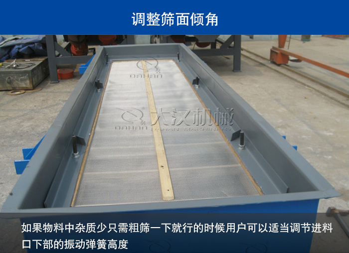 直線振動篩在設計時是有個傾斜角度的,通常情況下傾角為45°,但在實際使用過程中如果物料中雜質(zhì)少只需粗篩下就行的時候用戶可以適當調(diào)節(jié)進料口下部的振動彈簧高度,進料口高度升高可以加快物料在篩面的運動從而實現(xiàn)提高產(chǎn)量的效果。