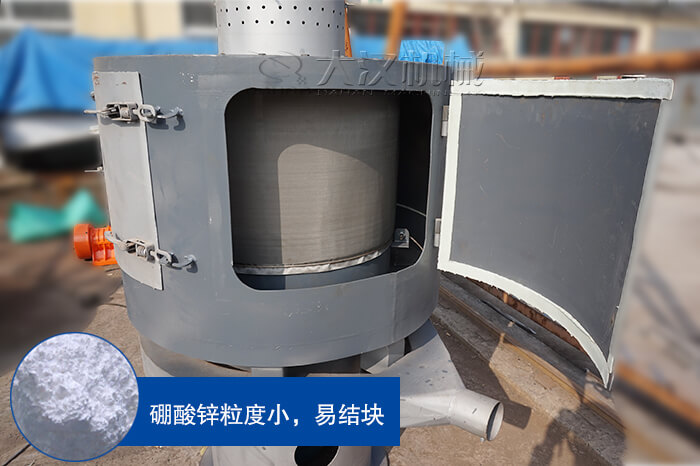 硼酸鋅粒度較小,篩分目數般比較精細,所以使用普通振動篩難以解決物料易漂浮這難題,而氣流篩通過螺旋輸送系統后,和氣流混合、霧化進入網筒內,通過網筒內風輪葉片使物料同時受離心力和旋風推進力,從而近使物料噴射過網,由細料排出口排出,不能過網的物料沿網筒壁從粗料排出口排出,可以解決硼酸鋅易于漂浮這問題。