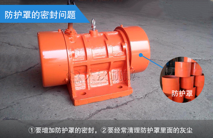 由于振動電機的工作環境大都非常惡劣、粉塵大,如果防護罩密封不嚴,很容易進灰塵,引起偏心塊的摩擦運轉,從而燒毀電機。所以在工作環境惡劣的地方,要增加防護罩的密封,二要經常清理防護罩里面的灰塵。