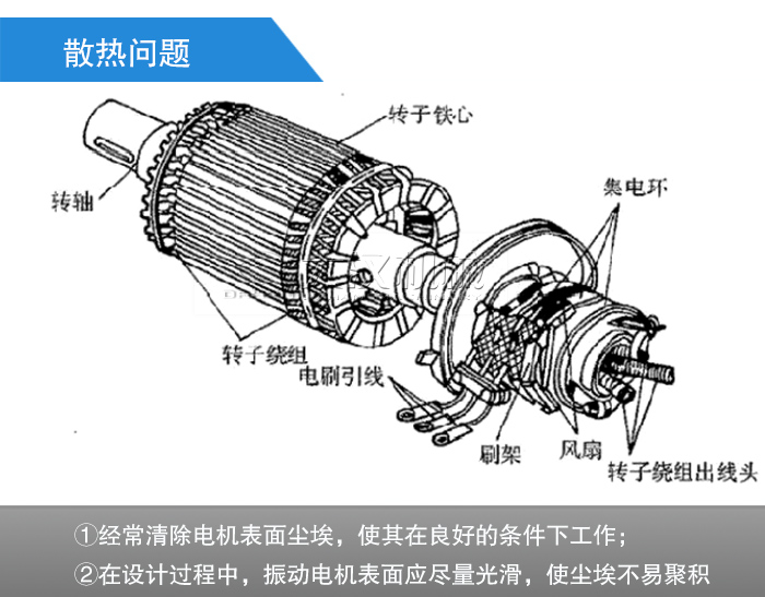 普通電機端有風扇,工作時使風向順著機殼上面的立筋流動,不僅散熱較快,而且也清除了上面的塵埃,使電機在良好的狀態下工作。而振動電機因無風扇可散熱,全靠自然冷卻,再加上工作環境大都非常惡劣,粉塵大,粉塵極易在電機表面堆積,從而引起內部溫度過高,燒毀電機。