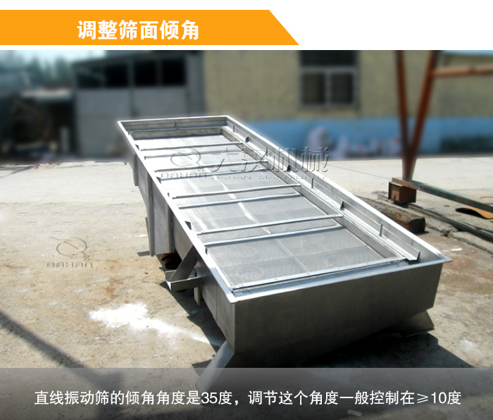 篩面傾角傾角大,料層在篩面上向前運(yùn)動(dòng)的速度就快,產(chǎn)量就大,但物料在篩面上停留的時(shí)間縮短,減少了顆粒透篩機(jī)會(huì),降低了篩分效率,直線振動(dòng)篩的傾角角度是35度,調(diào)節(jié)這個(gè)角度般控制在≥10度,需要注意的繼續(xù)調(diào)高就達(dá)不到篩分的效果了。