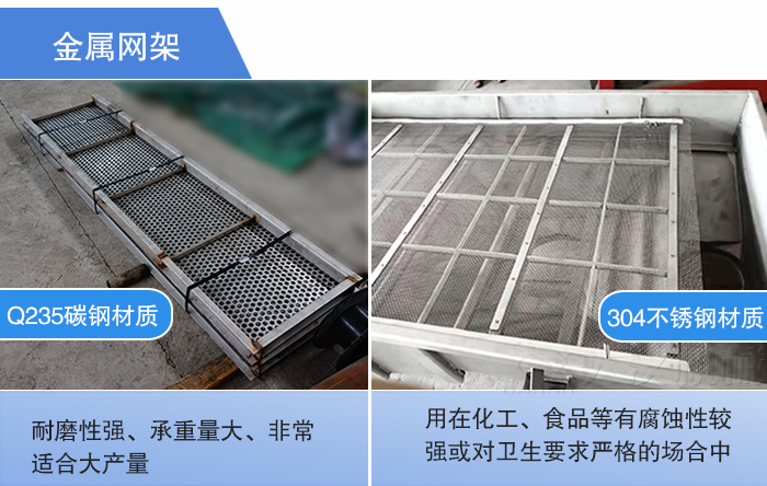 直線振動(dòng)篩金屬網(wǎng)架又叫鉤板式網(wǎng)架結(jié)構(gòu),其材質(zhì)可分為Q235碳鋼材質(zhì)結(jié)構(gòu)和304不銹鋼材質(zhì)結(jié)構(gòu)。